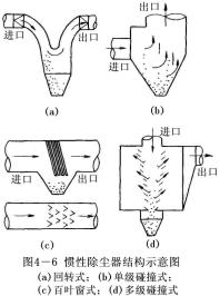 慣性除塵設備分為碰撞式和回轉式兩種。前者是沿氣流方向裝設一道或多道擋板,含塵氣體碰撞到擋板上使塵粒從氣體中分離出來。顯然,氣體在撞到擋板之前速度越高,碰撞后越低,則攜帶的粉塵越少,除塵效率越高。后者是使含塵氣體多次改變方向,在轉向過程中把粉塵分離出來。氣體轉向的曲率半徑越小。轉向速度越多,則除塵效率越高。